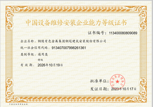中國(guó)設(shè)備維修安裝企業(yè)能力等級(jí)證書